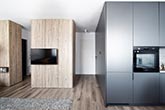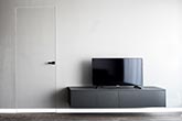 Chcąc stworzyć ścianę z płyt betonowych, wystarczy zastosować beton architektoniczny. Imitację płyt betonowych przyklejamy wtedy do powierzchni ściany oraz skrzydła drzwiowego, co tworzy spójną, industrialną całość.